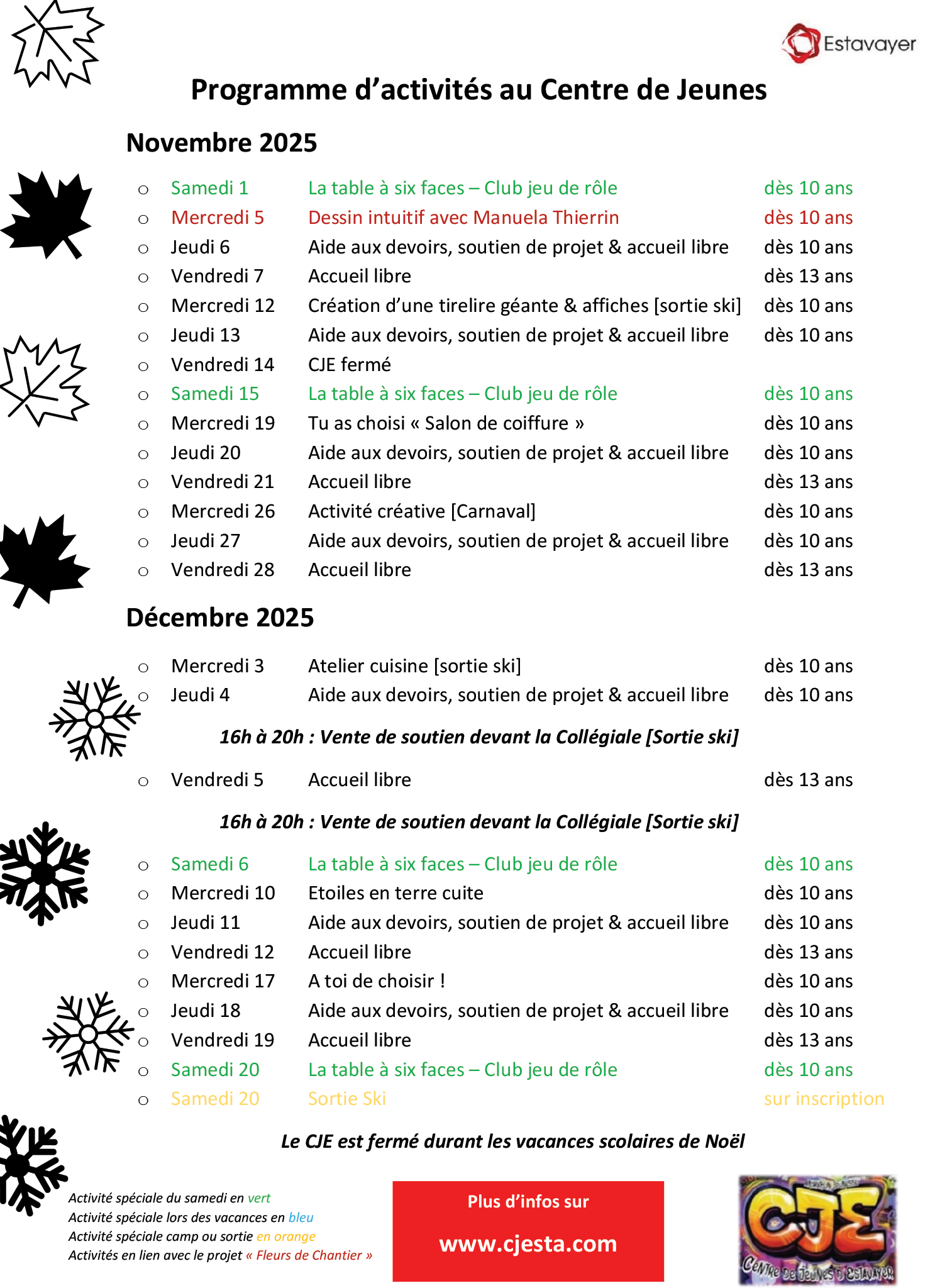Le programme de novembre et décembre 2025 t’attend : de quoi découvrir, t’amuser, apprendre et partager du temps avec d’autres jeunes d’Estavayer. Télécharge le programme complet en PDF et rejoins-nous !